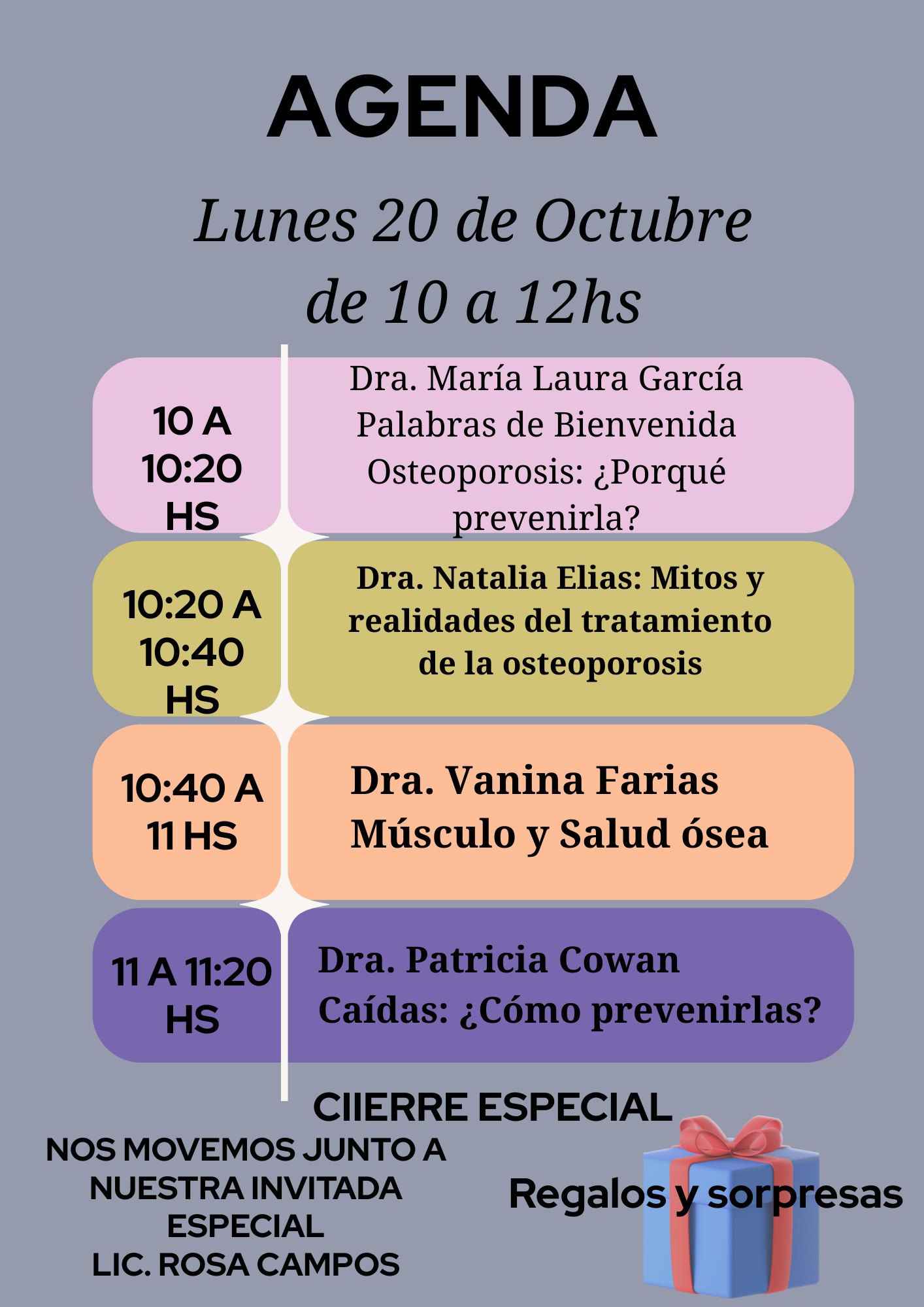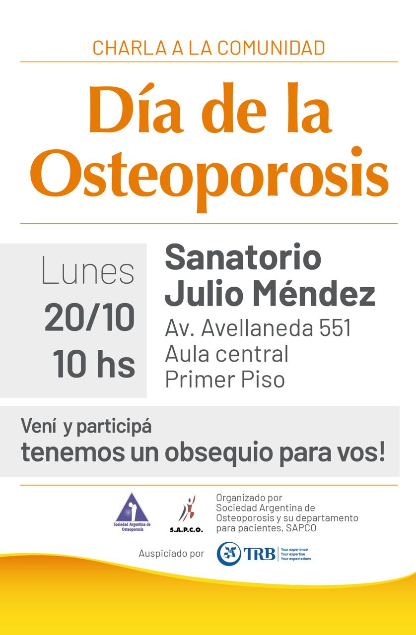 El Lunes 20 de octubre a las 10 horas daremos una CHARLA A LA COMUNIDAD con motivo del Día de la Osteoporosis, Organizada por la Sociedad Argentina de Osteoporosis SAO y la Sociedad de Amigos y Pacientes contra la Osteoporosis SAPCO.