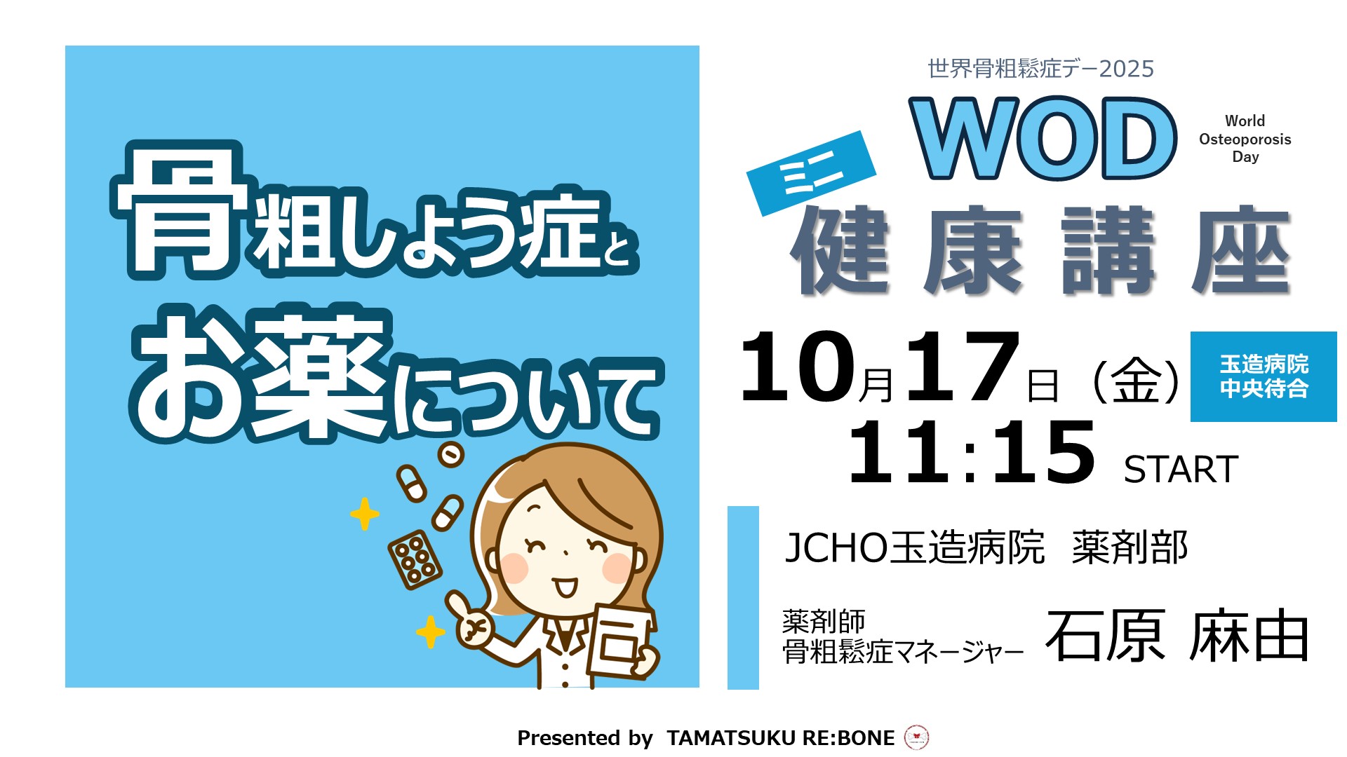 As part of the World Osteoporosis Day 2025 events, we will be holding a mini health seminar titled "Osteoporosis and Medications" Event info: Friday, October 17, 2025 Matsue City , Japan Matsue , Japan JCHO TAMATSUKURI HOSPITAL Organized by: JCHO TAMATSUKURI HOSPITAL TAMATSUKU RE:BONE Osteoporosis and anti-tip team) Share event