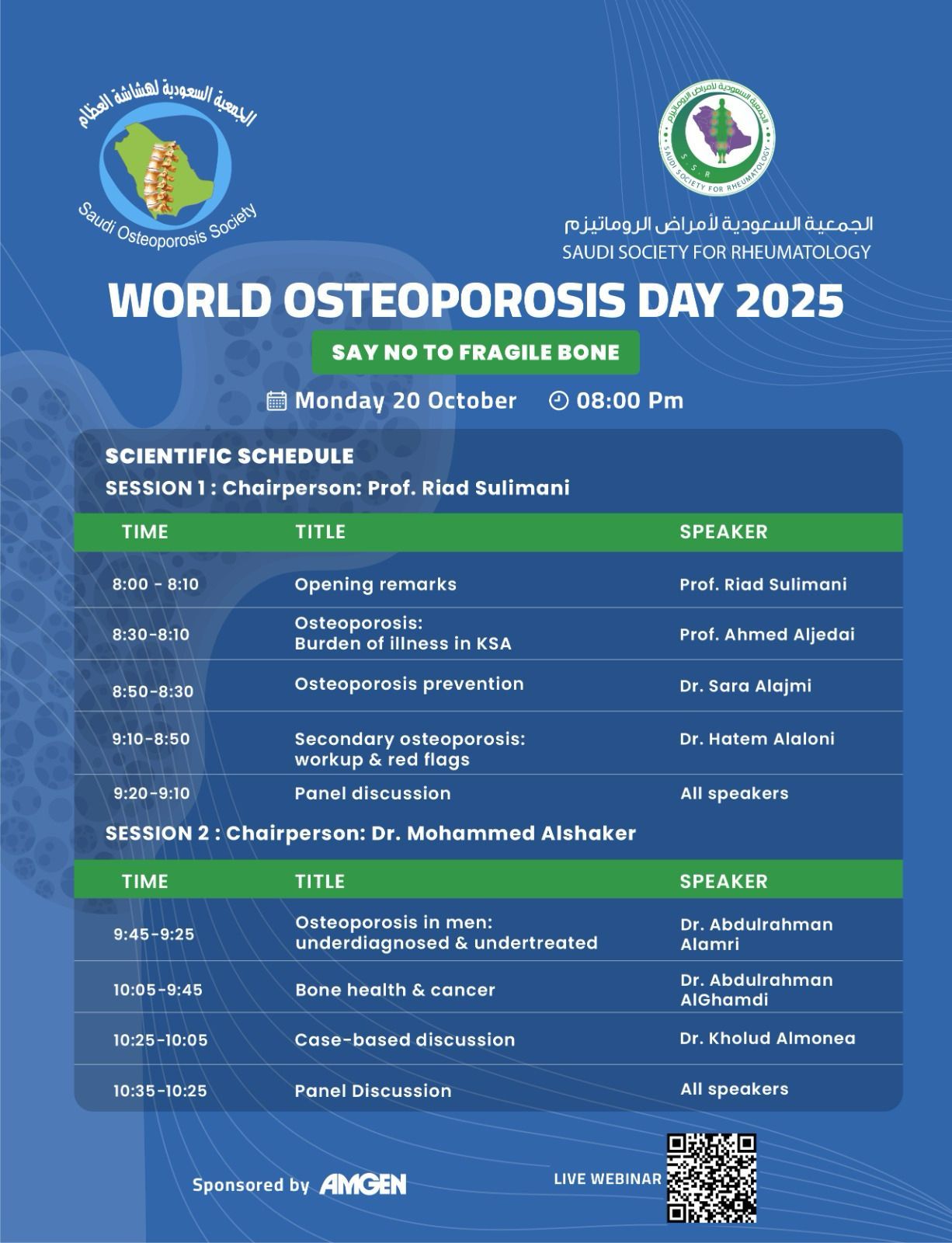 SAY NO TO FRAGILE BONE - WORLD OSTEOPOROSIS DAY WEBINAR Join in on a live webinar via zoom; for healthcare professionals Event info: Monday, October 20, 2025 Riyadh , Saudi Arabia Organized by: Saudi Osteoporosis Society & Saudi Society for Rheumatology Share event