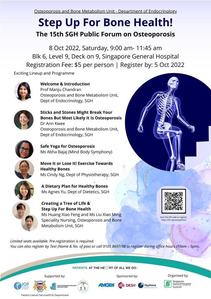 The Osteoporosis and Bone Metabolism Unit at Singapore General Hospital is back with our now much welcomed Public Forum on Osteoporosis! 15th year in its running!! Come up to Deck on 9, Level 9 at the Grand old dame that is Singapore General Hospital on October 8 2022 to learn about how to step up actively for your bone health. From vibrant presentations on osteoporosis, to show you how you can buff your bones up with bone strengthening exercises, eat right for your bones and have a master show you tips on safe yogic practices, we have lots lined up for you. And then at the end you can help to create a Tree of Life with your own valuable suggestions on how you would like to have healthy bones while munching on some high calcium local snacks made by a very worthy social enterprise that empowers differently abled kinsfolk amongst us.