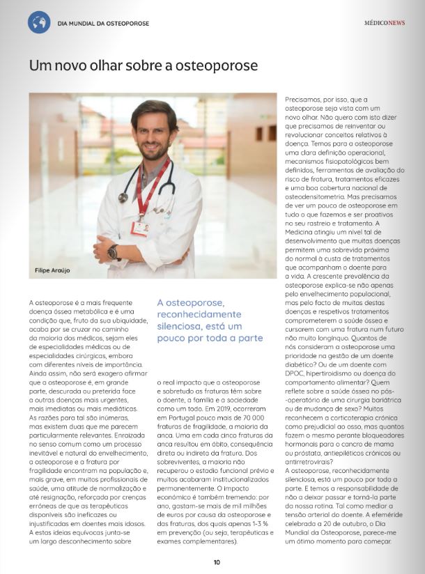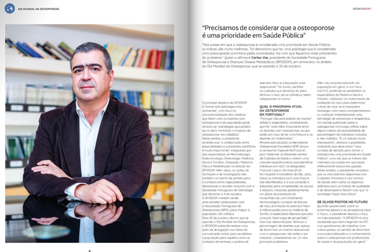 With the month of October marking World Osteoporosis Day and the National Day of the Fight against Pain, an edition of Médico News featured the testimonies of Dr Filipe Araújo, Secretary General of the SPODOM Board, and of Carlos Vaz, President of SPODOM, which highlighted the need to "consider Osteoporosis a Priority in Public Health".