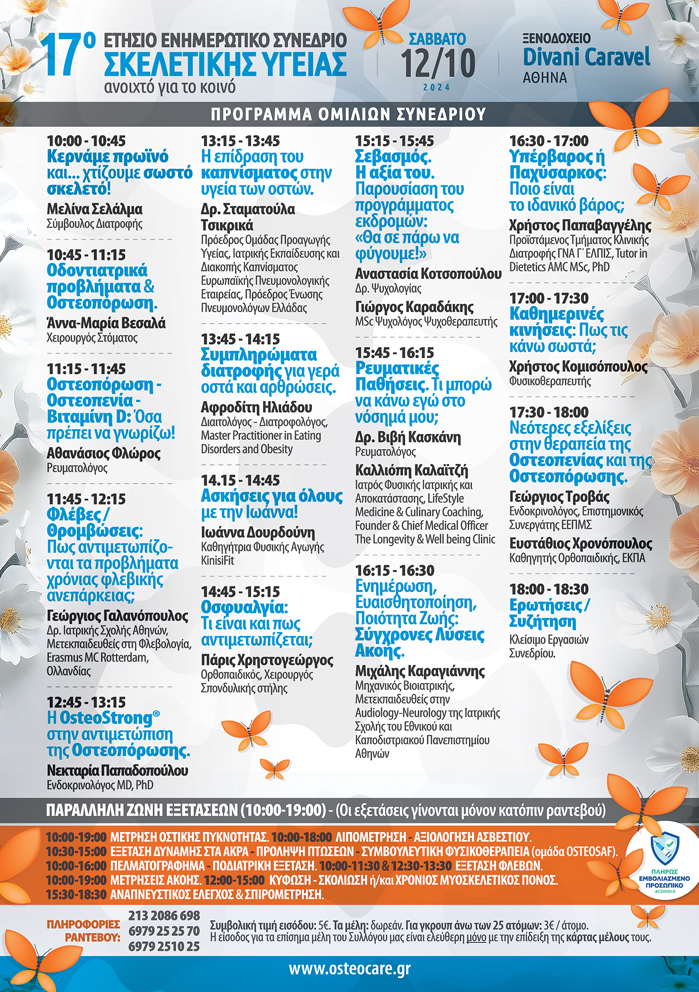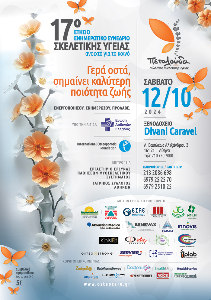 As every year, this year too the Butterfly Bone Health Society intends to celebrate World Osteoporosis Day by holding the 17th annual informative Conference, on Saturday, October 12, 2024, at the Divani Caravel Hotel, Athens.