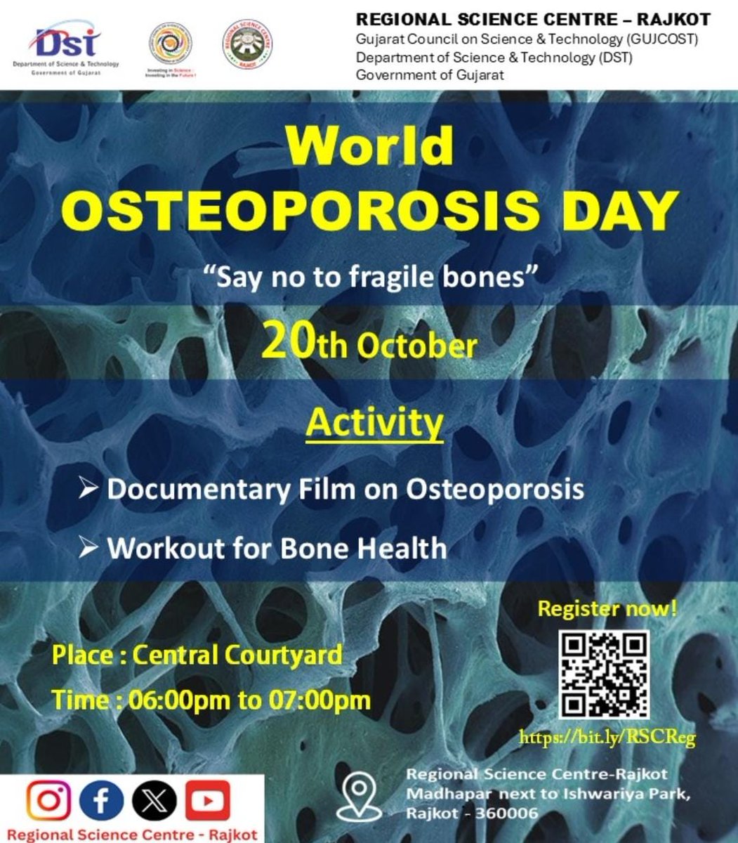 20th October is World osteoporosis day with theme,'Say no to fragile bones'. Join @RSCRajkot for Documentary Film on Osteoporosis and Workout for Bone Health. Register here : http://bit.ly/RSCReg