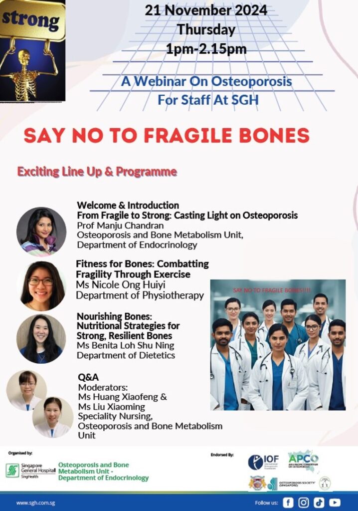 The Osteoporosis and Bone Metabolism Unit at Singapore General Hospital (SGH) will be commemorating World Osteoporosis Day with 2 educational events that will be held in November 2024. The first one is a unique webinar on Osteoporosis and Bone Health for Staff at SGH. The unit believes that “Education” begins at home and so this webinar in contrast to the public forums they have been holding for the last 17 years, aims to educate SGH staff, who themselves form part of the larger Singaporean community. The webinar inspired by the International Osteoporosis Foundation’s 2024 WOD theme will be a strong call to action by Health Care Providers saying “No to Fragile Bones”. It will feature talks by APCO Chairperson Prof Manju Chandran -Senior Consultant and Director of the Osteoporosis and Bone Metabolism Unit, Ms Nicole Ong Huiyi – Physiotherapist and Ms Benita –Loh Shu Ning- Dietitian.