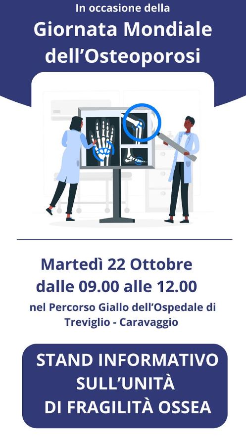 Nel Percorso Giallo dell’Ospedale di Treviglio – Caravaggio, dalle 09.00 alle 12.00, Giuseppina Resmini e Greta Manfredini, Medici ortopedici afferenti alla Sc di Ortopedia e Traumatologia diretta da Raymond Klumpp, l’infermiera Alice Spoldi, operanti nel nuovo ambulatorio iperspecialistico, forniranno consigli a uomini e donne sull’osteoporosi; saranno, altresì, disponibili a visionare eventuale loro documentazione clinica-strumentale (esami ematochimici, referti di MOC o Radiografie rachide dorso-lombare), indirizzandoli verso il percorso di cura o di prevenzione più idoneo all’interno della nostra ASST.