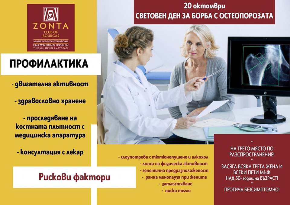 Zonta Club of Burgas organises an information campaign aimed at the general public to raise awareness of osteoporosis. Together with facts about the disease and its consequences, the Club offers advise on nutrition and exercise as an important part of prevention.