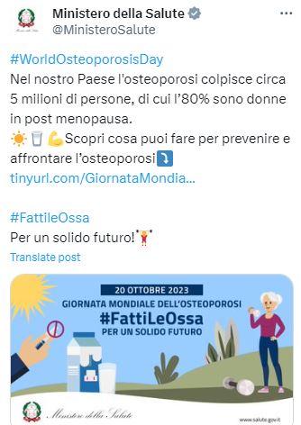 Article and social media issued by the Italian Ministry of Health - using IOF WOD graphics https://www.salute.gov.it/portale/donna/dettaglioNotizieDonna.jsp?lingua=italiano&menu=notizie&p=dalministero&id=6361 Event info: Friday, October 20, 2023 Rome , Italy Organized by: Ministero della Salute Italia Share event