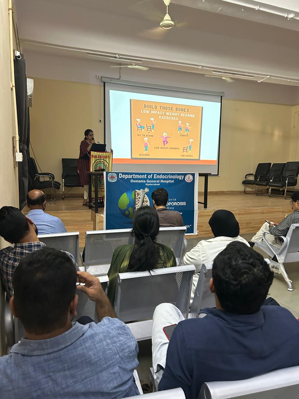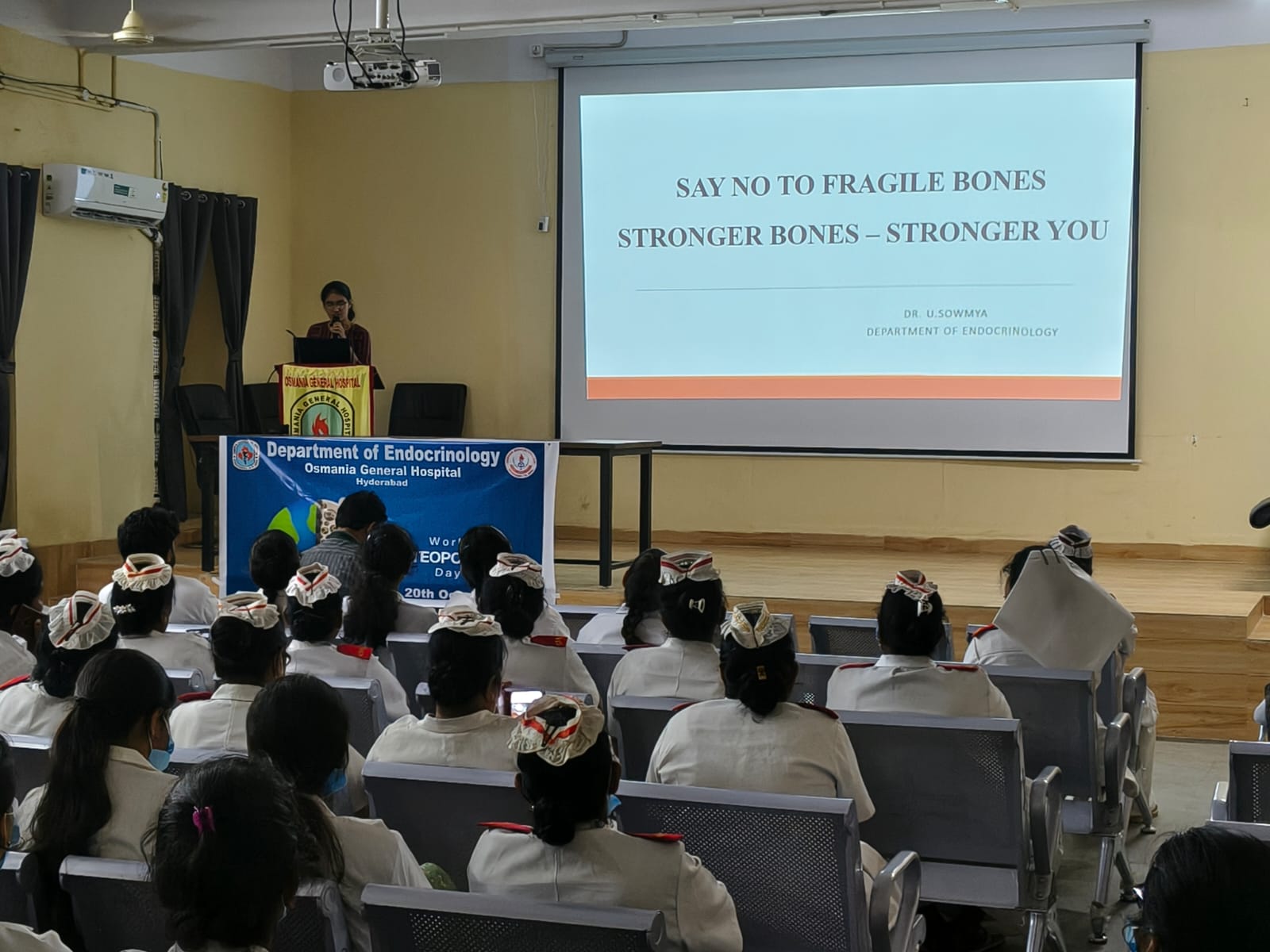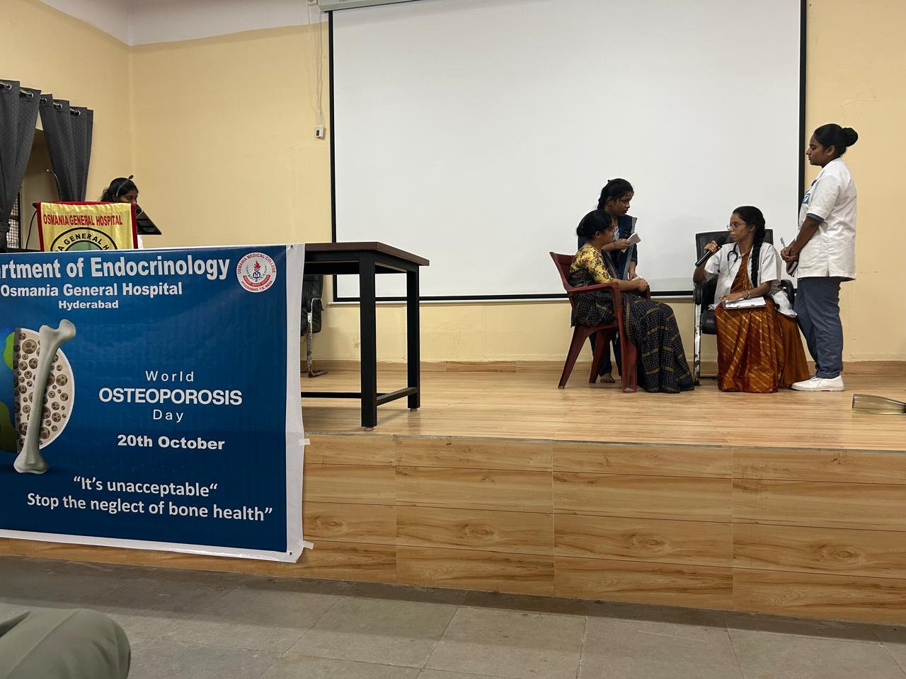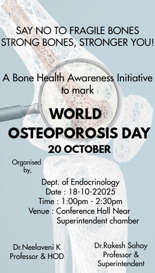 An awareness program was organized in the hospital seminar hall on the occasion of World Osteoporosis Day to promote understanding and prevention of osteoporosis. The session was attended by nursing students, residents, physiotherapists, and faculty members. The event began with an introduction by the Department of Endocrinology highlighting the importance and pathophysiology of osteoporosis, followed by an engaging skit performed by nursing practitioners. The program concluded with a practical demonstration by physiotherapists on exercises aimed at strengthening bones, preventing falls, and reducing fracture risk.