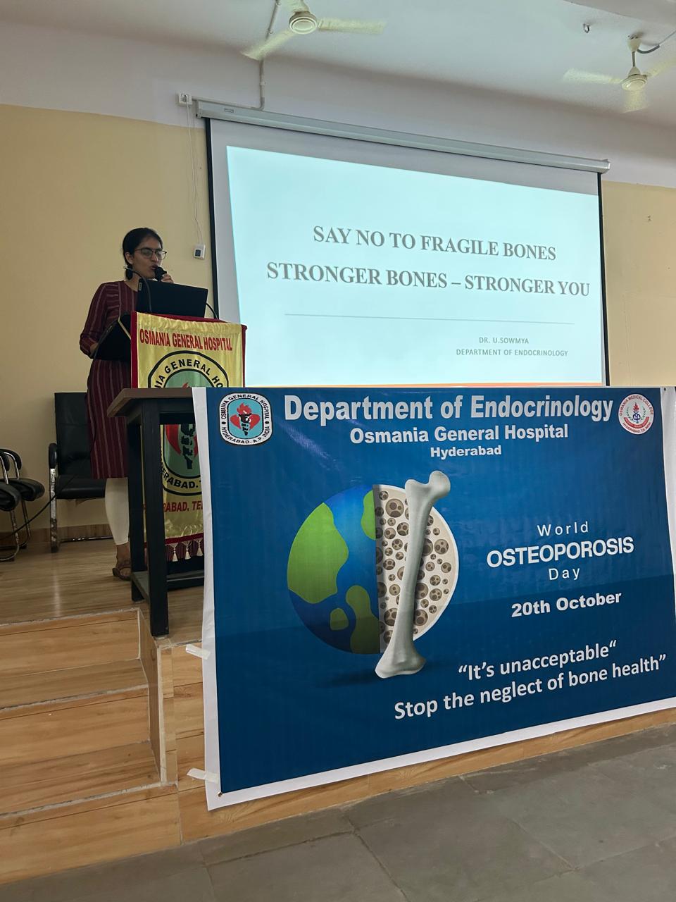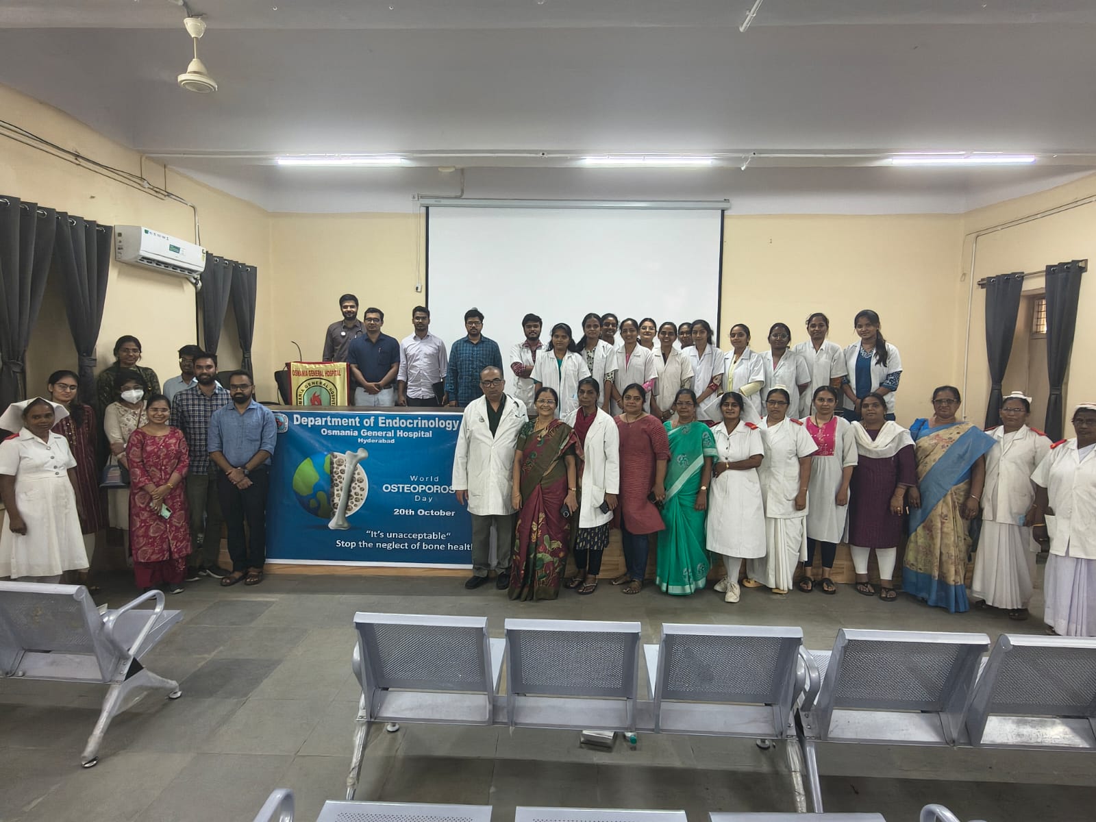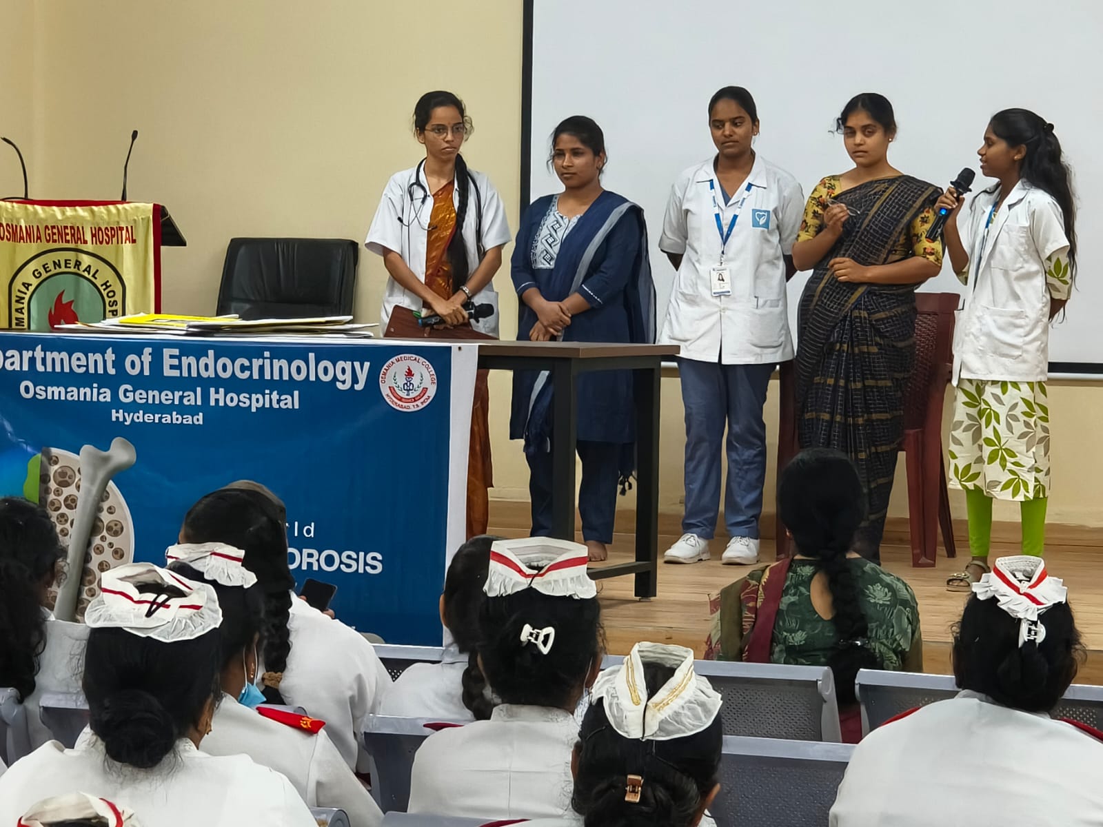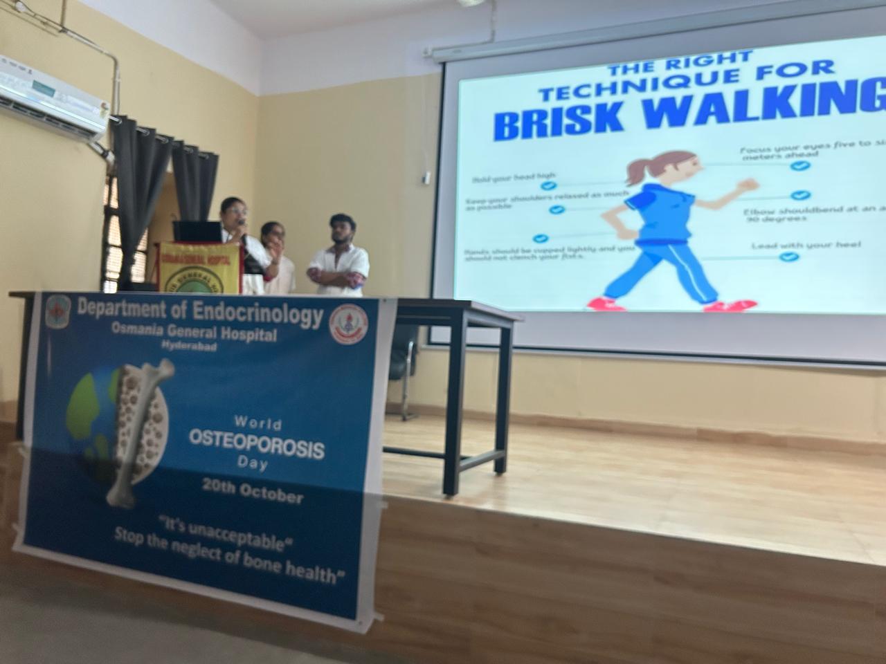 An awareness program was organized in the hospital seminar hall on the occasion of World Osteoporosis Day to promote understanding and prevention of osteoporosis. The session was attended by nursing students, residents, physiotherapists, and faculty members. The event began with an introduction by the Department of Endocrinology highlighting the importance and pathophysiology of osteoporosis, followed by an engaging skit performed by nursing practitioners. The program concluded with a practical demonstration by physiotherapists on exercises aimed at strengthening bones, preventing falls, and reducing fracture risk.