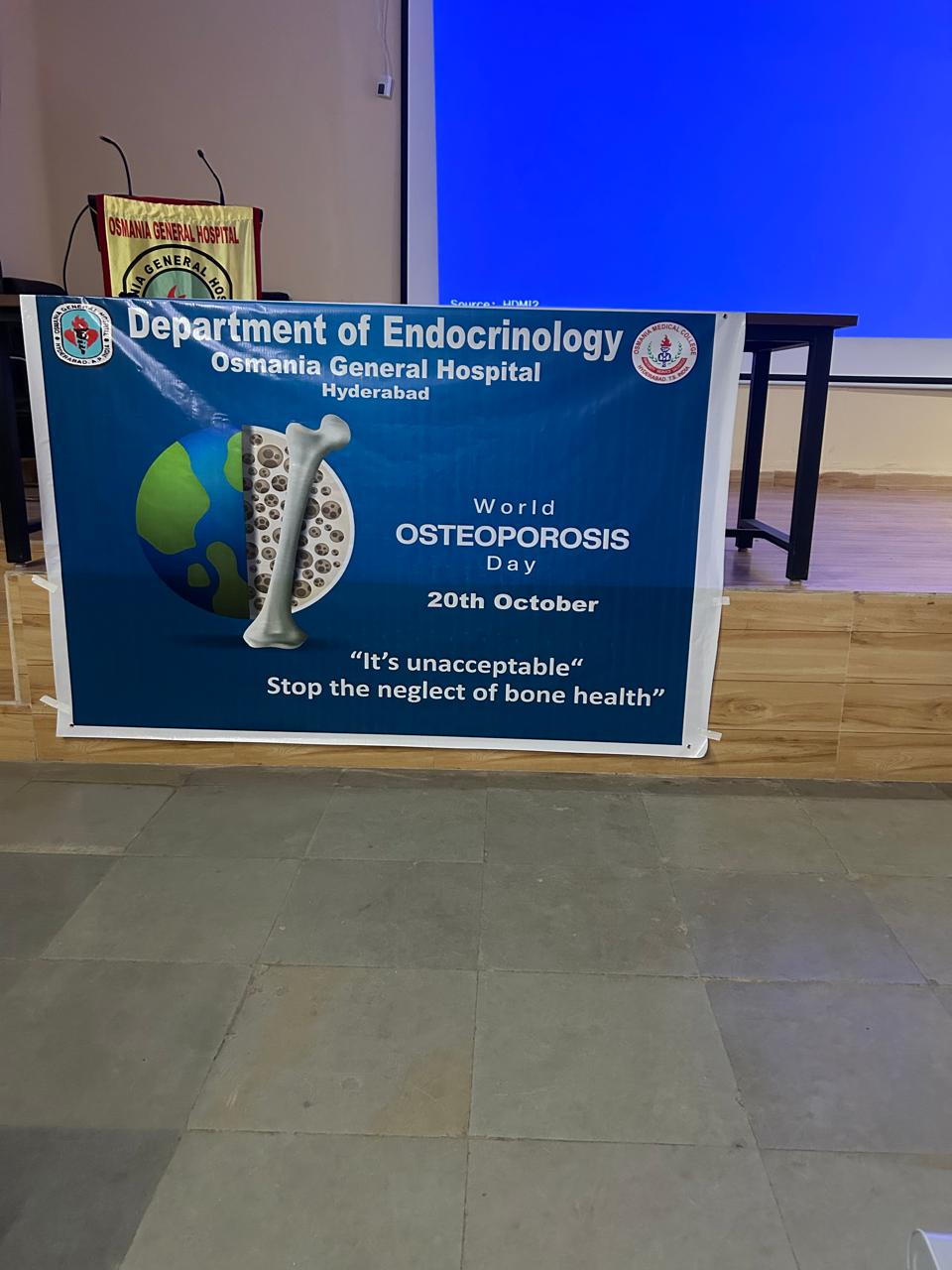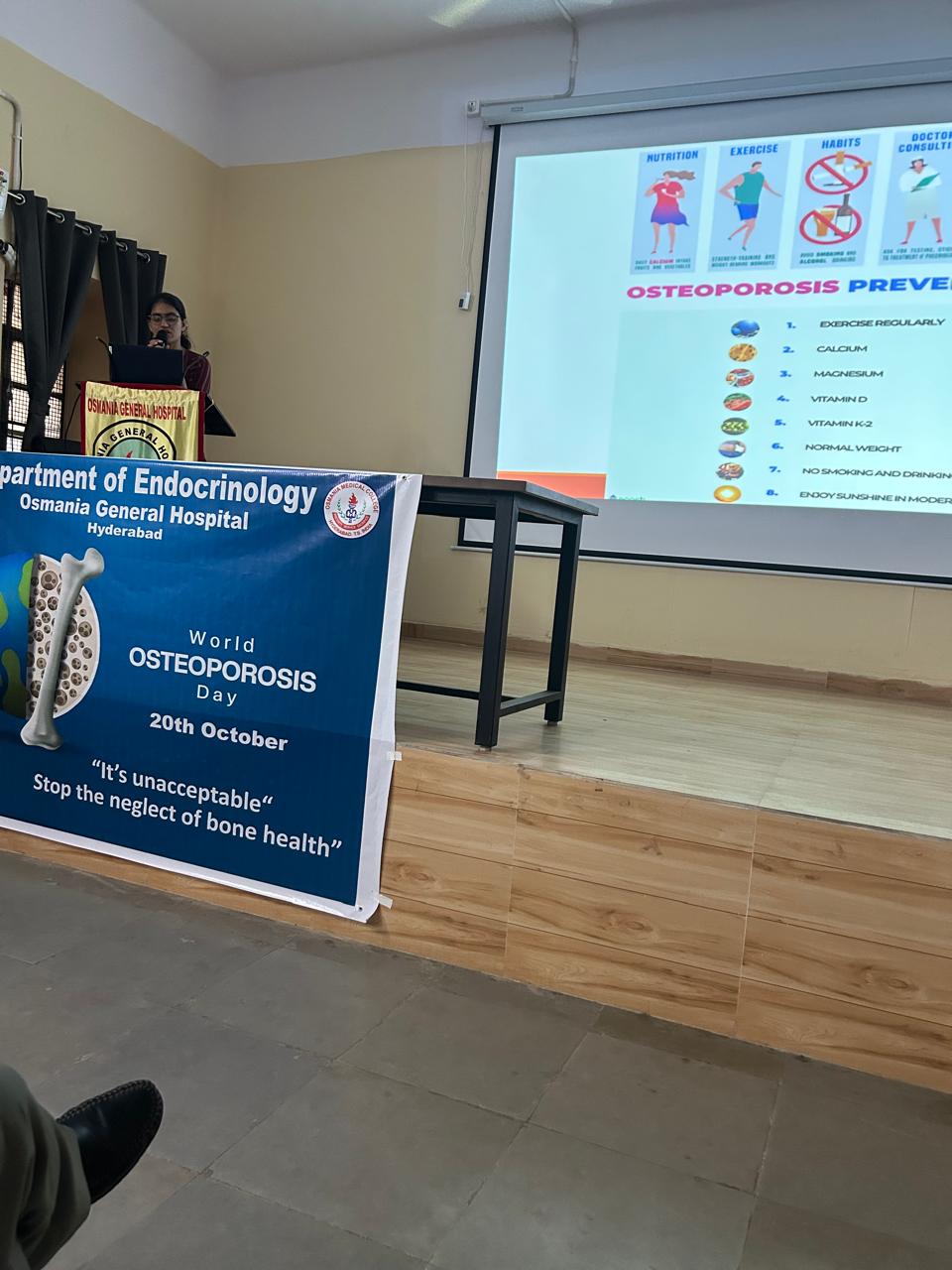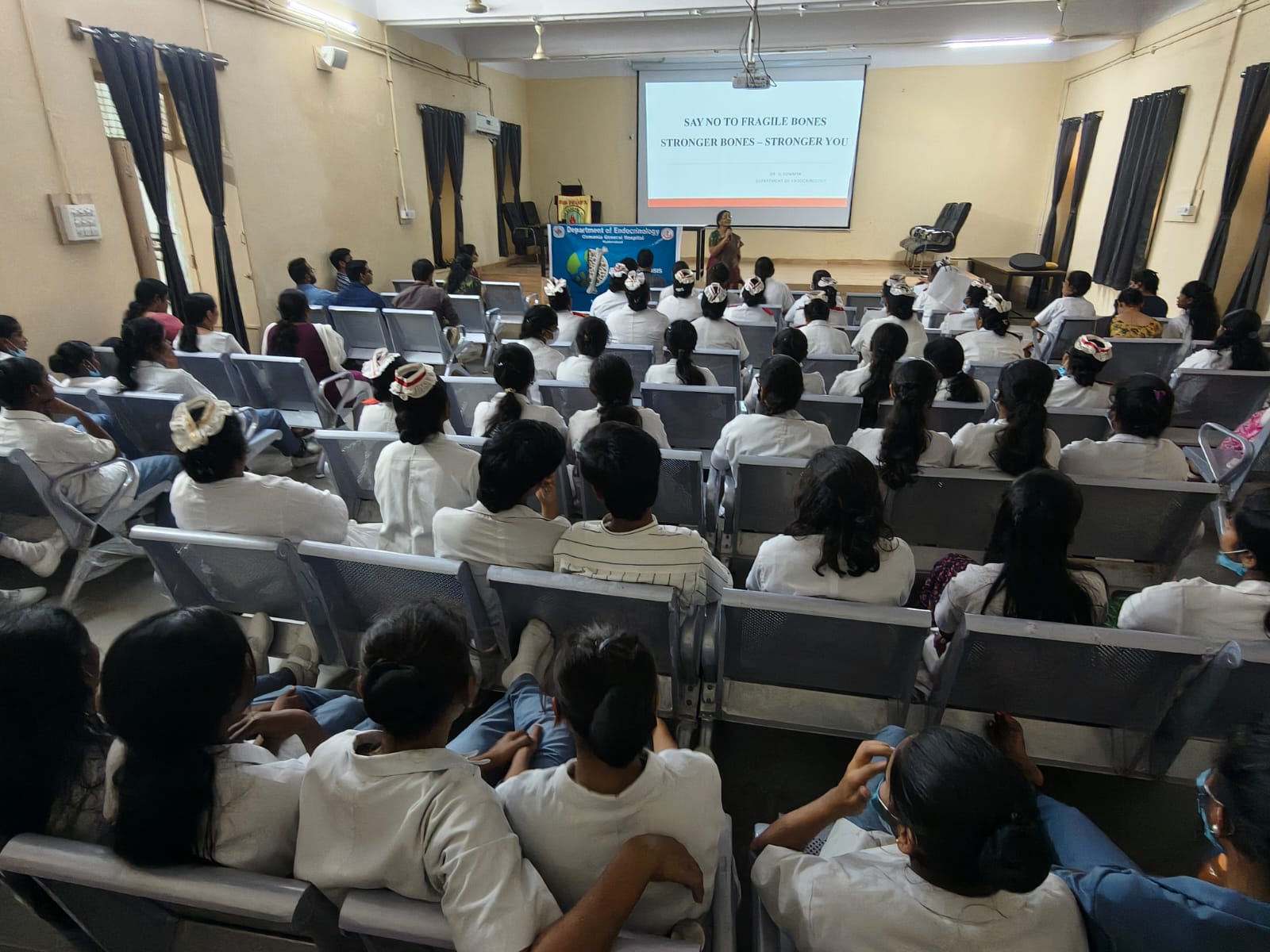 An awareness program was organized in the hospital seminar hall on the occasion of World Osteoporosis Day to promote understanding and prevention of osteoporosis. The session was attended by nursing students, residents, physiotherapists, and faculty members. The event began with an introduction by the Department of Endocrinology highlighting the importance and pathophysiology of osteoporosis, followed by an engaging skit performed by nursing practitioners. The program concluded with a practical demonstration by physiotherapists on exercises aimed at strengthening bones, preventing falls, and reducing fracture risk.