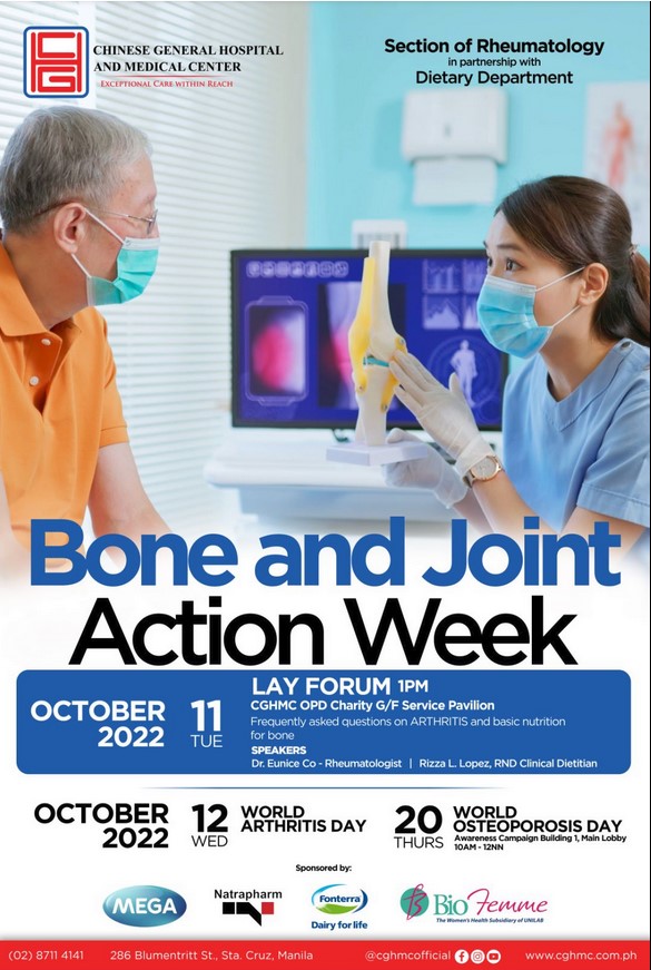 In celebration of World Arthritis Day (October 12) and World Osteoporosis Day (October 20), join the CGHMC Section of Rheumatology in raising awareness of rheumatic, musculoskeletal diseases, and bone health through Bone and Joint Action Week. Please see the poster for more details.
