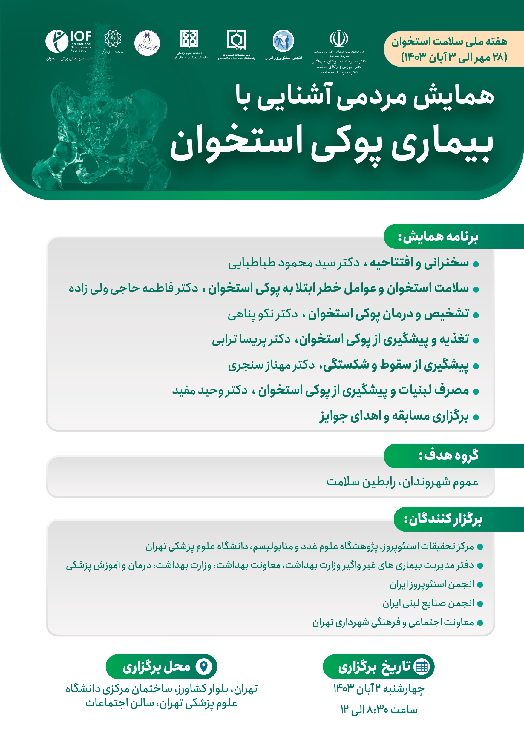 Where: Tehran University of Medical Sciences Auditorium Topics include: Understanding osteoporosis Preventing bone loss Healthy lifestyle choices Managing osteoporosis