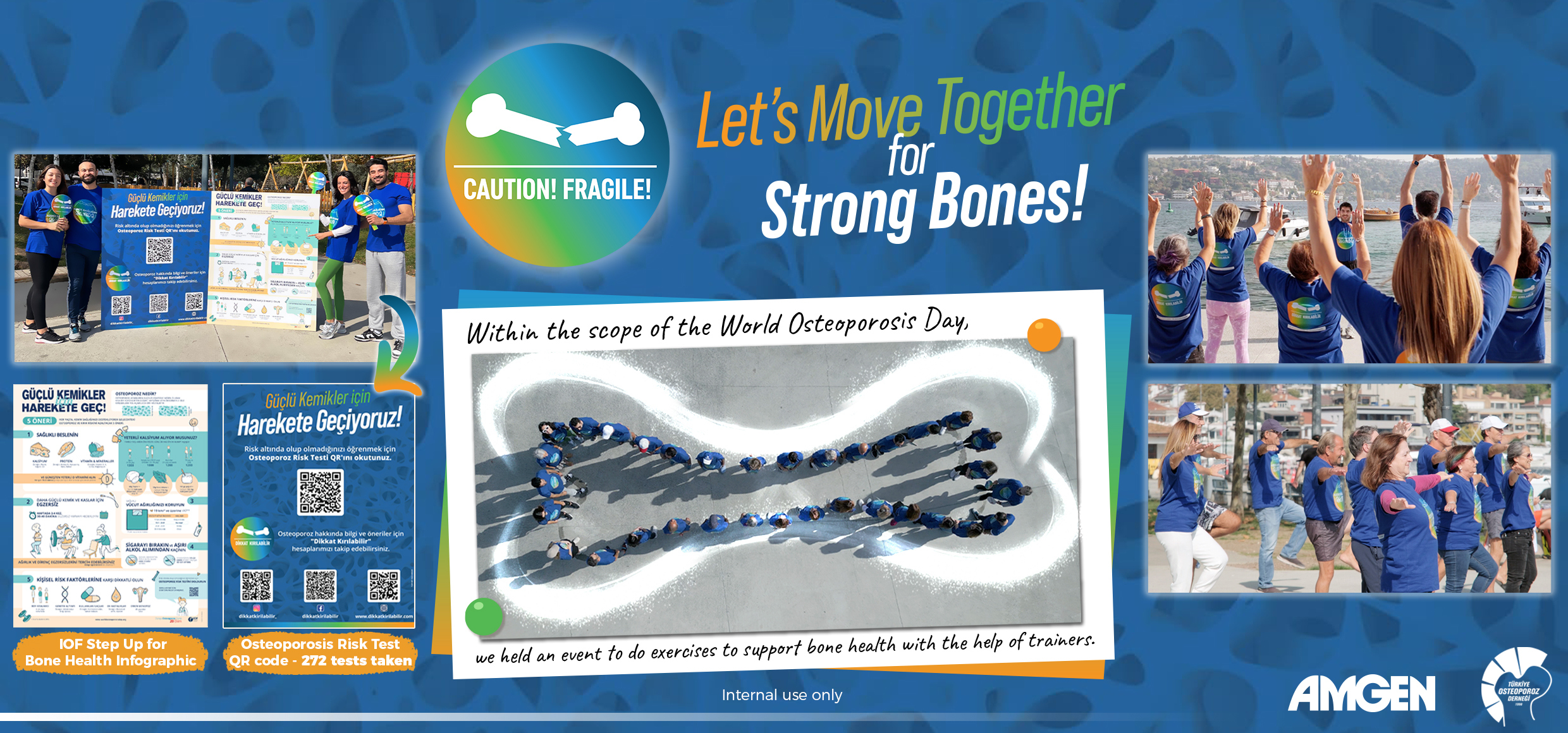 We are delighted to share the highlights of the World Osteoporosis Day Awareness Campaign in Türkiye, with the theme 'Let's Move Together for Strong Bones!' During our campaign event, we organized exercise activities along the Bosphorus in Istanbul, with guidance from instructors and participants who were informed through the 'Caution! Fragile!' social media channels. We also benefited from the 'Step Up for Bone Health' content prepared by the IOF to raise public awareness and encourage people to take an osteoporosis risk test through our web resources. Over 250 individuals completed the osteoporosis risk test using the QR code located on our event area poster.