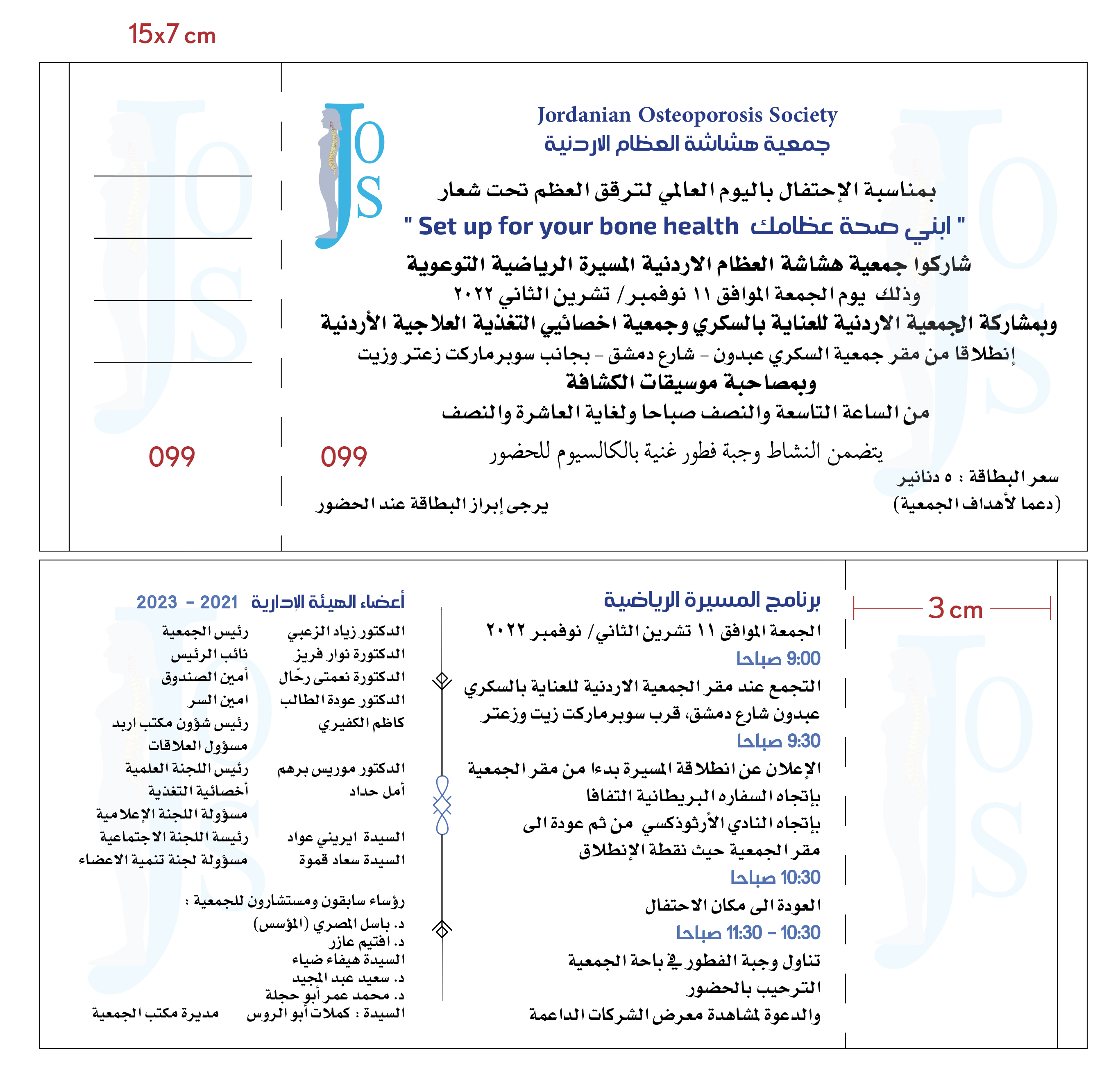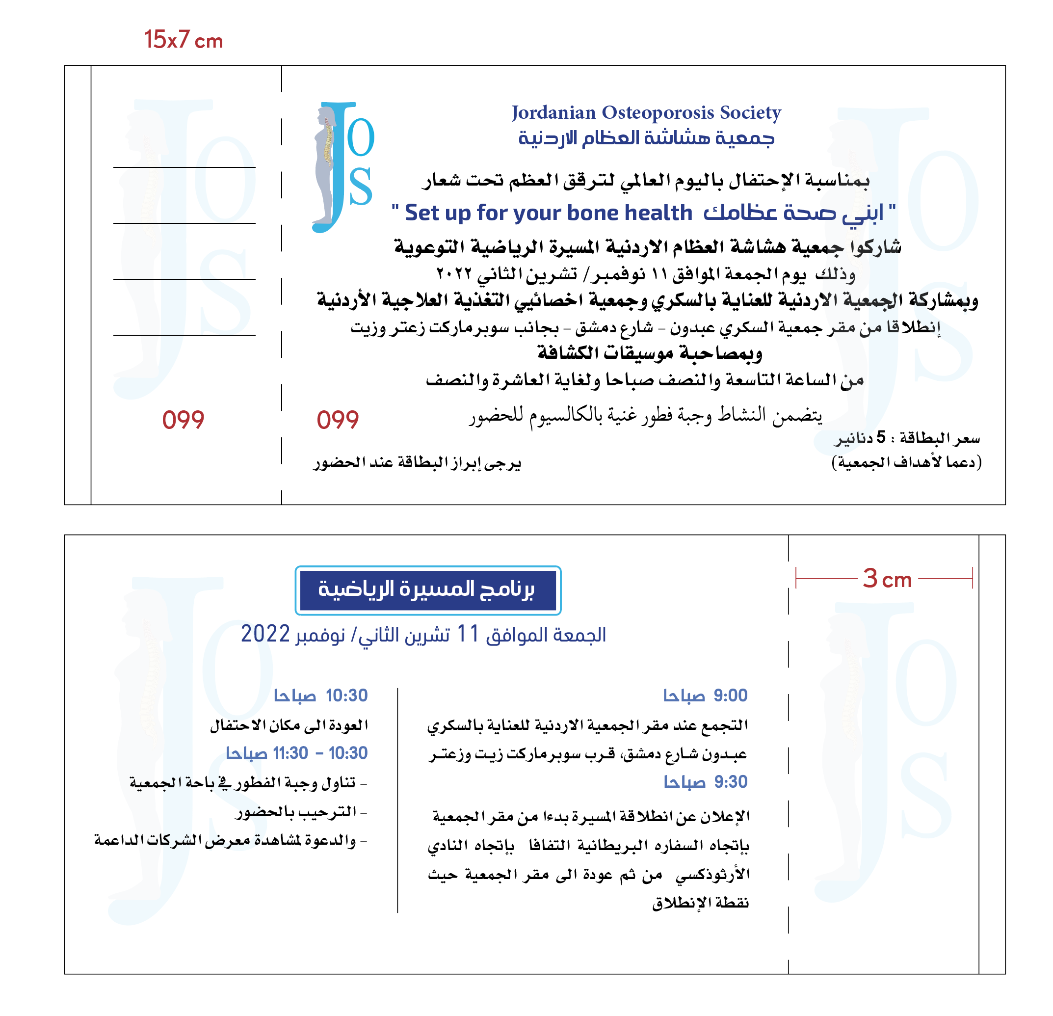 A march celebrating WOD Set up for your bones Event info: Friday, November 11, 2022 to Friday, November 11, 2022 Amman , Jordan Abdoun Organized by: Jordanian Osteoporosis prevention society JOPS Share event