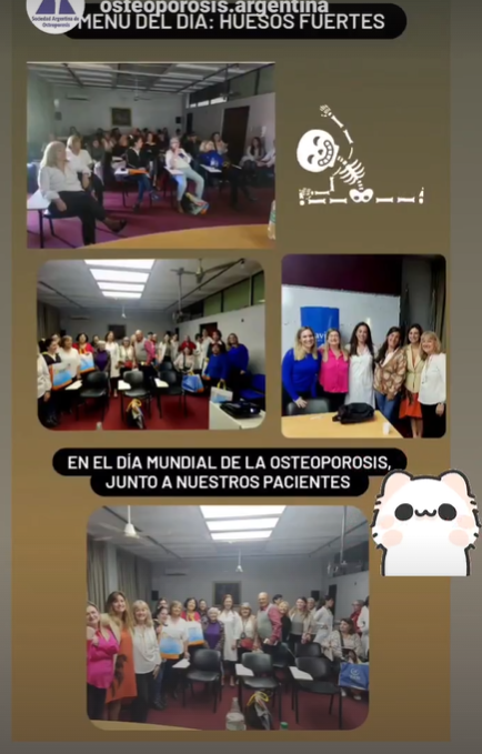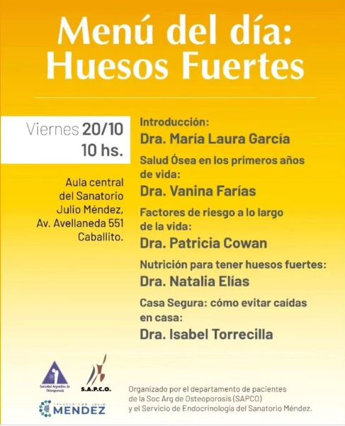 En conmemoración al Día Mundial de la Osteoporosis realizamos una charla de prevención de osteoporosis con nuestros pacientes, con excelente concurrencia y participación. Con el aval de Sociedad Argentina Osteoporosis (SAO) , Sociedad Amiga para Pacientes con Osteoporosis (SAPCO), International Osteoporosis Foundation (IOF) y Comité de Docencia e Investigación Sanatorio Méndez y Servicio de Endocrinología del Sanatorio DrJulio Méndez.