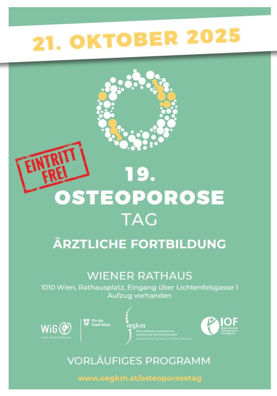 The full day event for healthcare professionals (free of charge) will be held in Vienna on October 21st. Sessions will address updates on guidelines, treatment thresholds, strategies to optimize early identification of high risk patients, and secondary risk factors. An excellent way to mark World Osteoporosis Day! For complete information visit: http://oegkm.at/osteoporosetag
