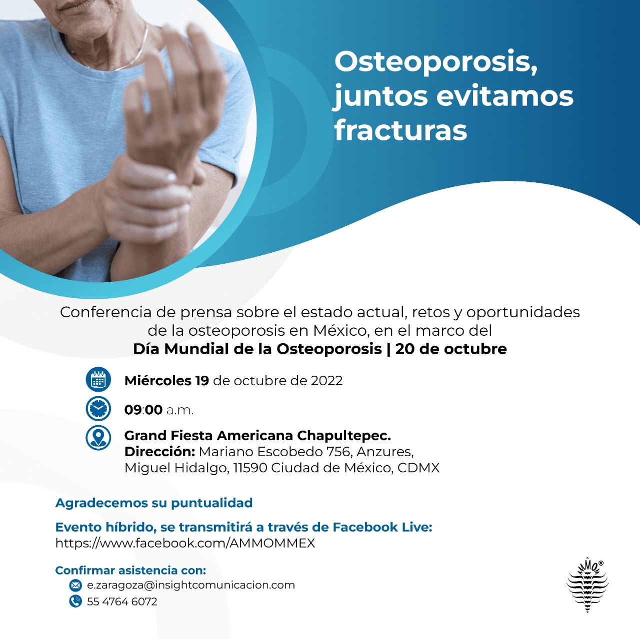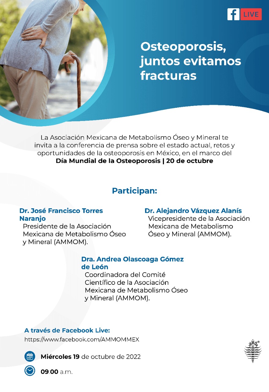 The Mexican Association of Bone and Mineral Metabolism (AMMOM), within the framework of World Osteoporosis Day to be commemorated on October 20, reports on the current status, challenges and opportunities of osteoporosis in Mexico, and calls for prevention of this disease through a press release.