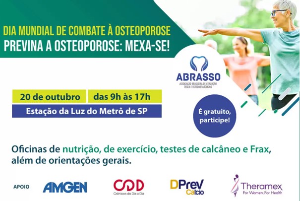 The campaign “ Prevent Osteoporosis: Get Moving!” , which will take place on World Osteoporosis Day, October 20th, at the Luz subway station in São Paulo, from 9 am to 5 pm and free of charge, is focused on information on preventing osteoporosis according to five essential pillars: diet, physical exercise, strengthening bones, muscles and joints.