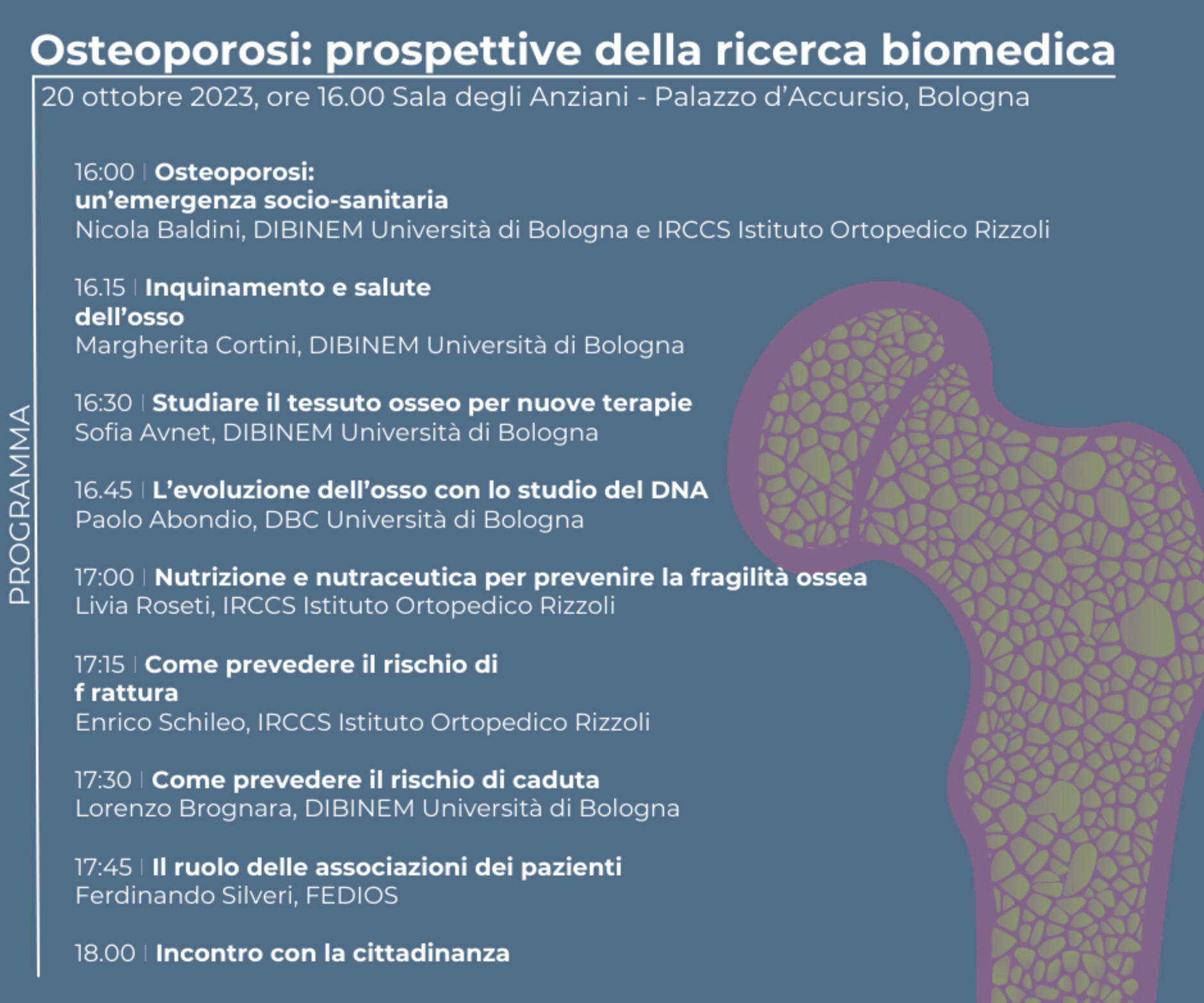 October 13, 2023On the occasion of World Osteoporosis Day, on Friday 20 October at 4pm in the Sala degli Anziani of Palazzo D'Accursio, researchers from the IRCCS Istituto Ortopedico Rizzoli and the University of Bologna will meet citizens to talk about osteoporosis.