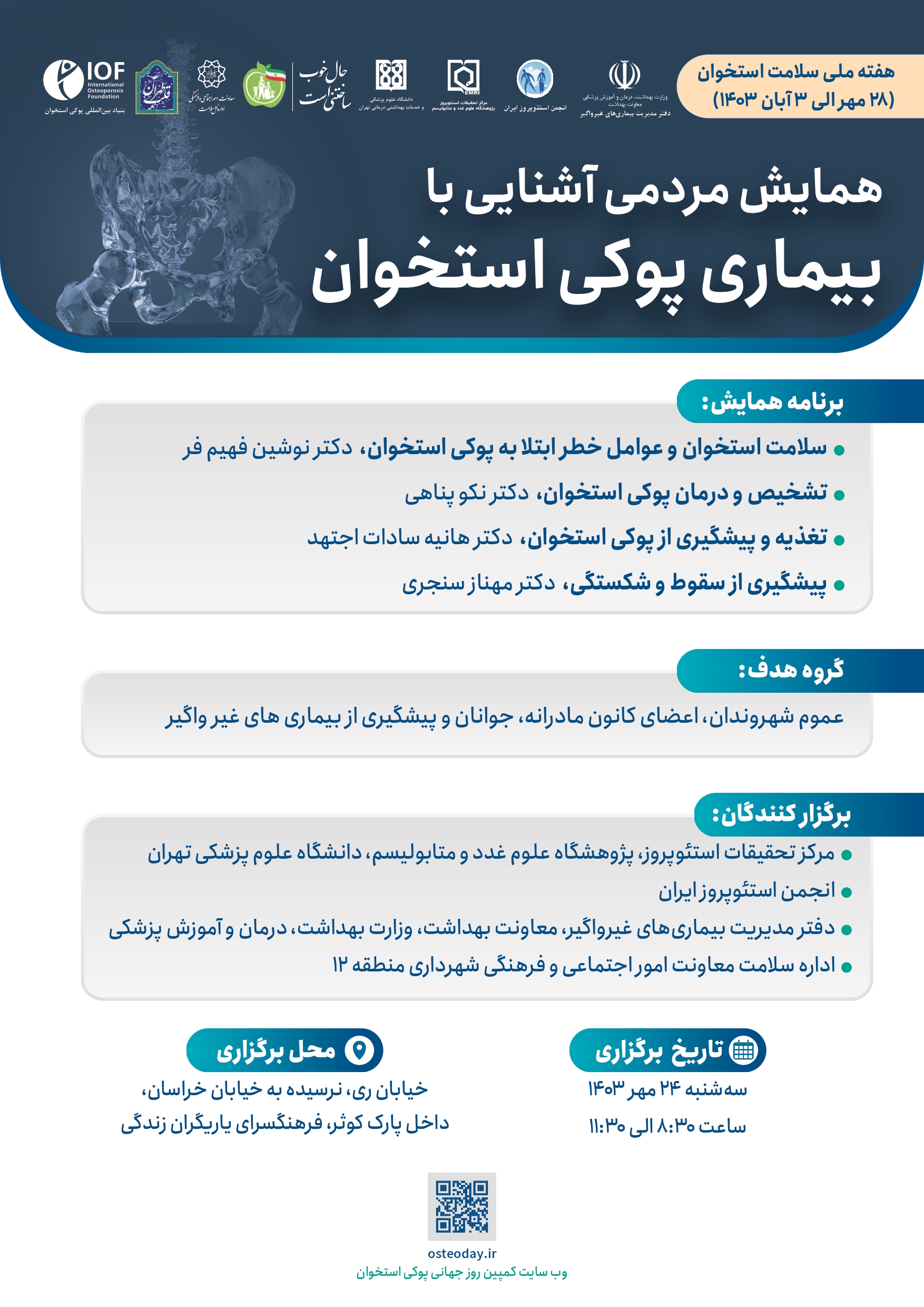 The Osteoporosis Research Center of the Endocrinology and Metabolism Research Institute, in collaboration with the Iranian Osteoporosis Society, the Non-communicable Diseases Management Office of the Ministry of Health and Medical Education, and the Deputy of Social and Cultural Affairs of Tehran Municipality, is pleased to invite you to a series of public symposiums on osteoporosis, coinciding with National Bone Health Week (October 28-November 3, 2023).