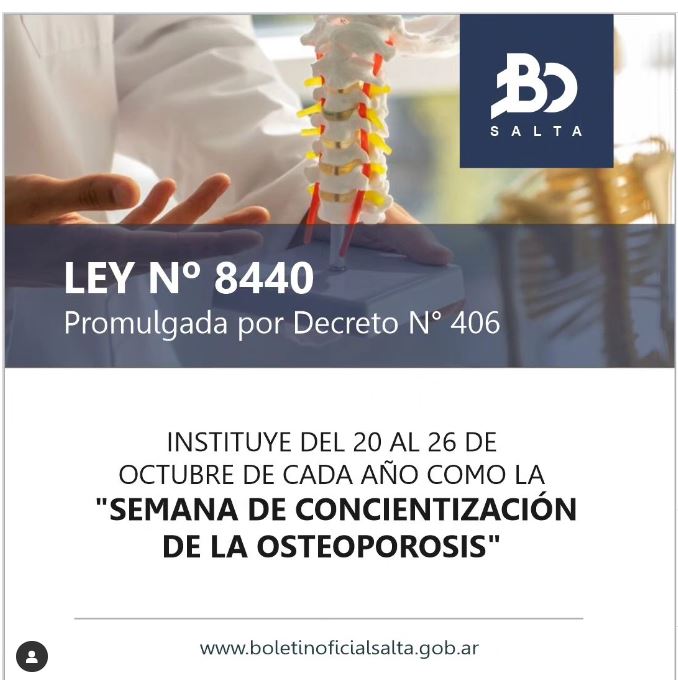 La ley N° 8440 instituye la semana del 20 al 26 de octubre como la semana de Concientización de la Osteoporosis, implementando acciones de prevención a nivel provincial.