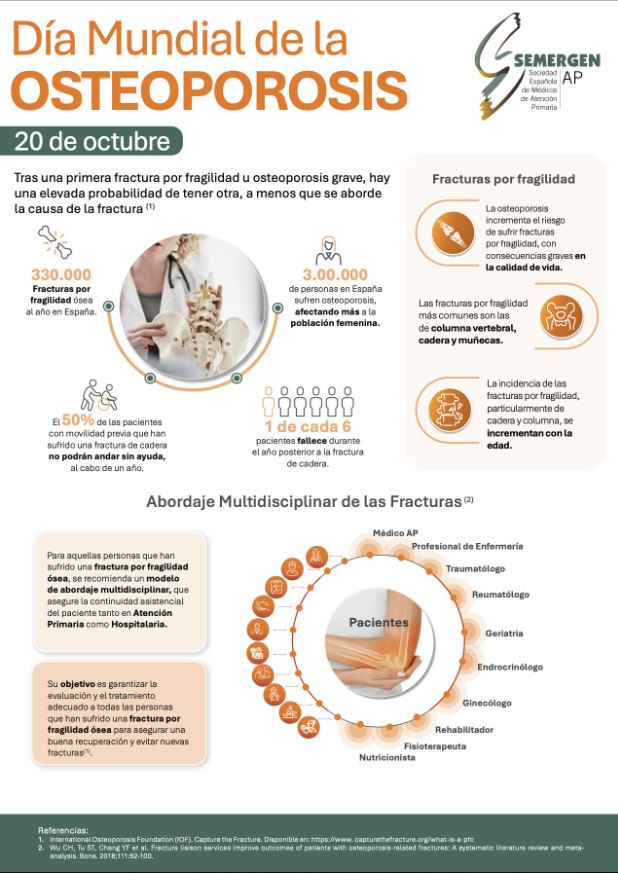 For World Osteoporosis Day, the Spanish Society of Primary Care Physicians (SEMERGEN) published and shared on social media a leaflet outlining the burden of osteoporosis and showing the importance of multidisciplinary cooperation in osteoporosis management.
