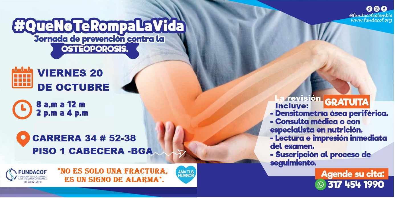 ATENCIÓN BUCARAMANGA Es el mes de la osteoporosis. la fundación de lucha contra la osteoporosis en Colombia se encuentran liderando campañas gratuitas un diagnostico a tiempo puede salvar tus huesos.
