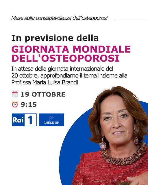 On October 19, on the occasion of the month on Osteoporosis awareness, in view of the World Osteoporoses Day on October 20, the President of FIRMO, Prof. Maria Luisa Brandi, will be the guest of the program "Check Up" on Rai 1, on air from 09:00.
