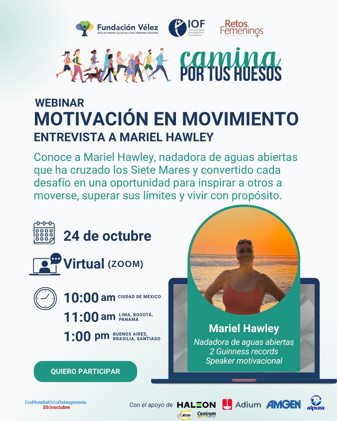 In this #CaminaPorTusHuesos (WalkForYourBones) webinar, Sylvia Sánchez Alcántara, creator of Retos Femeninos @retosfemeninosoficial, talked to Mariel Hawley @marielhawley, Mexican open water swimmer and double Guinness record holder, about how to find motivation in every challenge, believe in yourself, and stay consistent to achieve your goals.