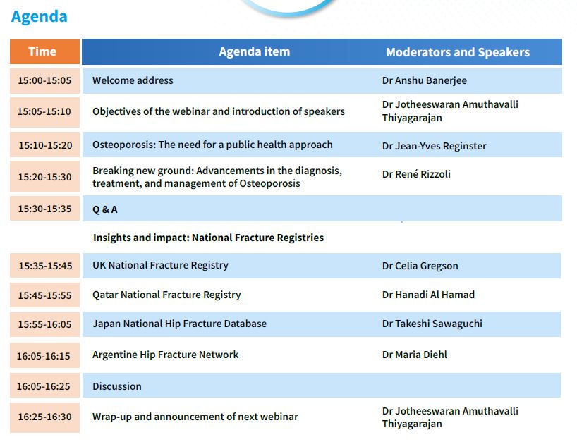Professors Jean-Yves Reginster and René Rizzoli, members of IOF’s Executive Committee, are among the many expert speakers. They will discuss the burden of osteoporosis and advances in its diagnosis and management. The event will also share best practices from countries that have successfully implemented National Fracture Registries. These registries have proven effective in improving fracture monitoring and treatment coverage, and the webinar will provide valuable insights for other nations seeking to adopt similar evidence-based strategies.